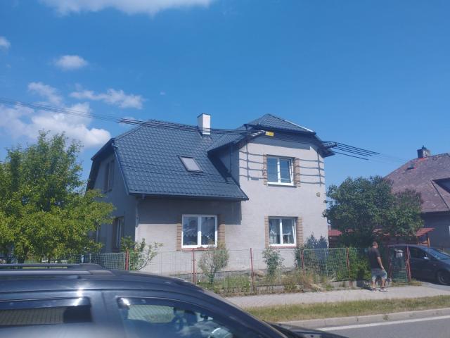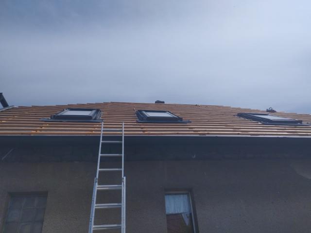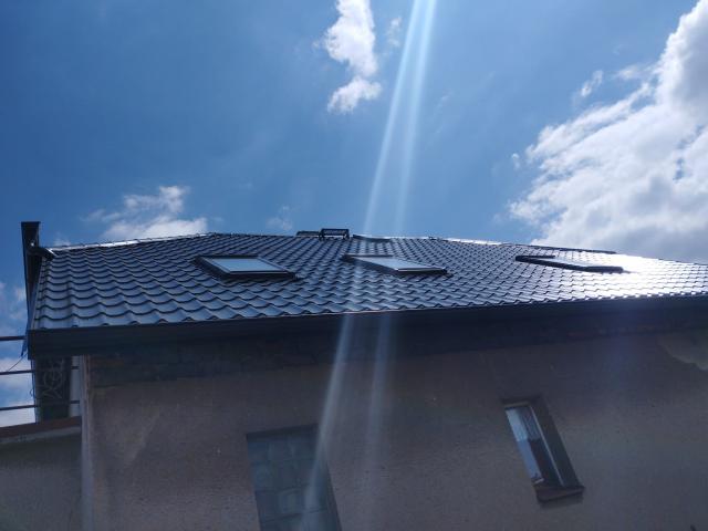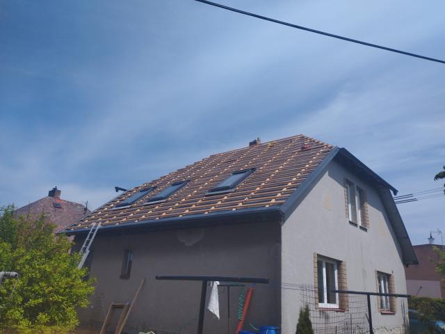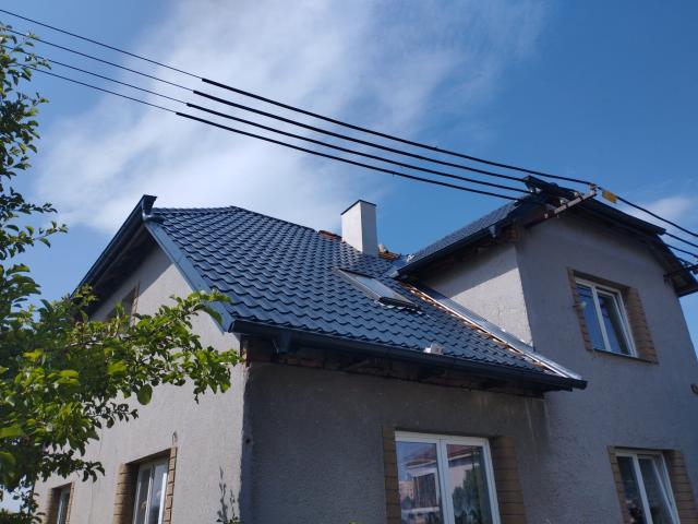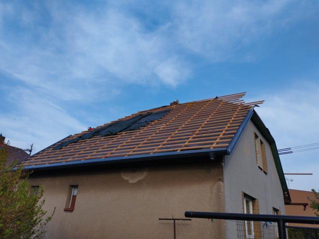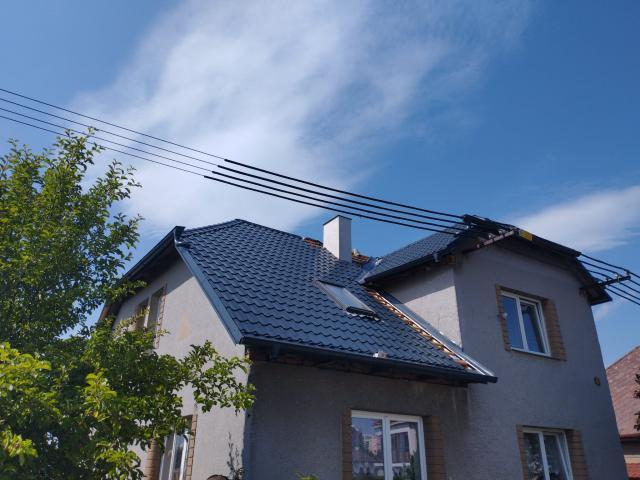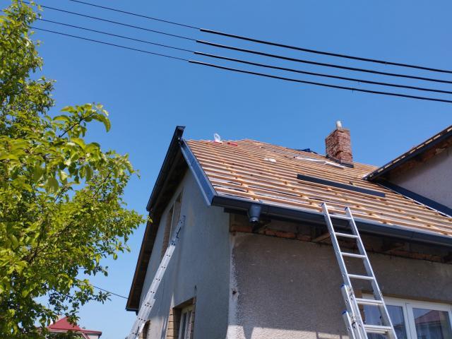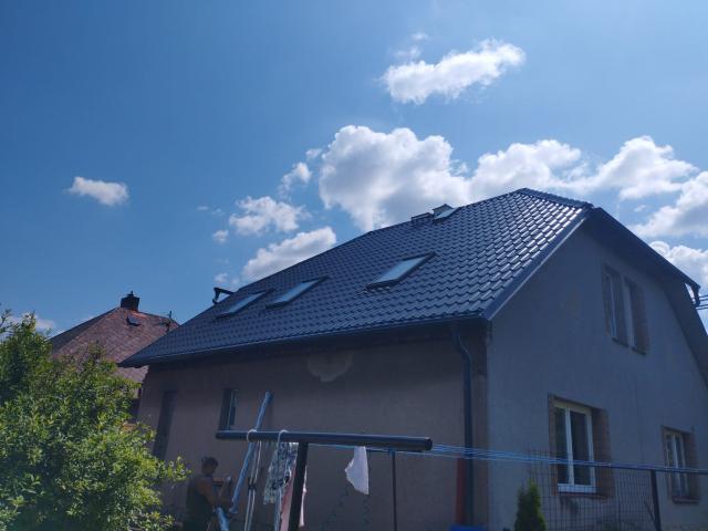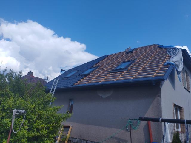 Zákazníci si vybrali krytinu Satjam v antracitu jako náhradu za stávající eternit. Při demontáži střechy jsme odhalili několik míst, kde zatékalo, i když to přes starou krytinu nebylo poznat, a opravili jsme poškozené pobití střechy. Následovalo položení difúzní folie, montáž okapnic a laťování. Po dokončení pochozí části střechy jsme rekonstruovali komín, namontovali klempířské prvky a střešní okna, a poté jsme mohli přistoupit k pokládce krytiny.