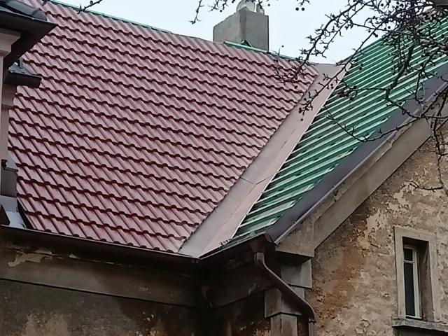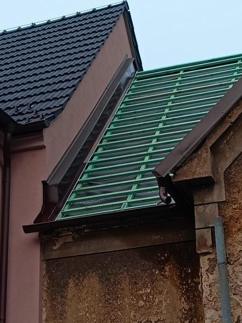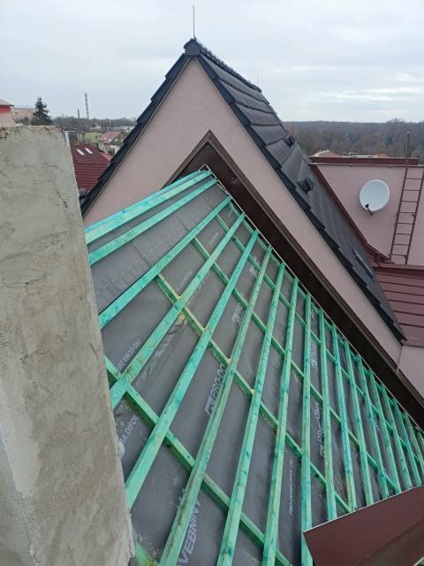 Střecha byla kompletně rozebrána až na krov, který jsme důkladně ošetřili. Poté jsme provedli montáž nové difuzní fólie, kvalitního oplechování včetně napojení na sousední dům a osadili žlaby a svody od ověřené firmy Zambelli. Následně jsme položili novou krytinu a střechu dokončili podle všech platných standardů.